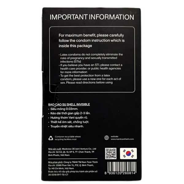 Sản phẩm là dòng bao cao su nổi tiếng của thương hiệu Shell. Thời gian bảo hành của bao cao su Shell Invisible kéo dài 5 năm và quy cách đóng gói với 10 cái trong một hộp.