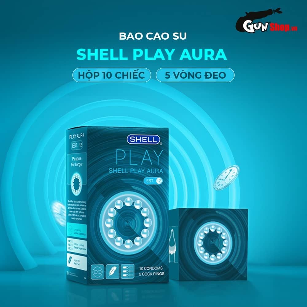➴ Mỗi hộp Shell Play Aura gồm 10 bao cao su siêu mỏng giá rẻ và kèm 5 vòng đeo chứa 12 bi silicon lớn.