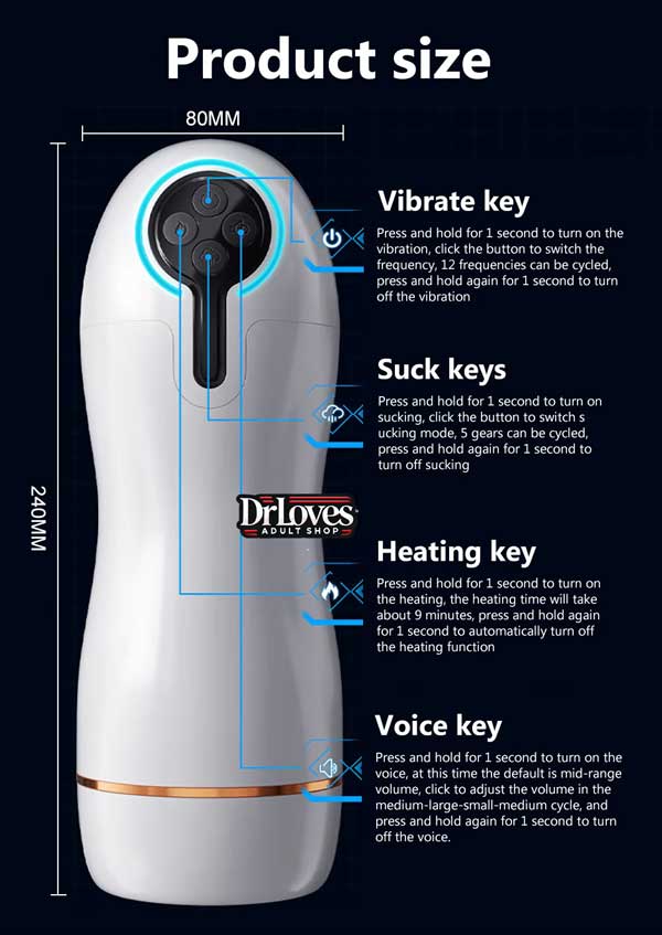 | Điểm nổi bật | 10 chế độ rung, âm thanh cảm biến theo tần số, bú mụt tự động như thật, chế độ rung mạnh, động cơ êm ái, chống nước, chức năng tạo nhiệt độ nóng ấm giống như nhiệt độ của cơ thể người, gai gân và điểm nổi, giải tỏa sinh lý hiệu quả, sạc pin, 5 chế độ hút |